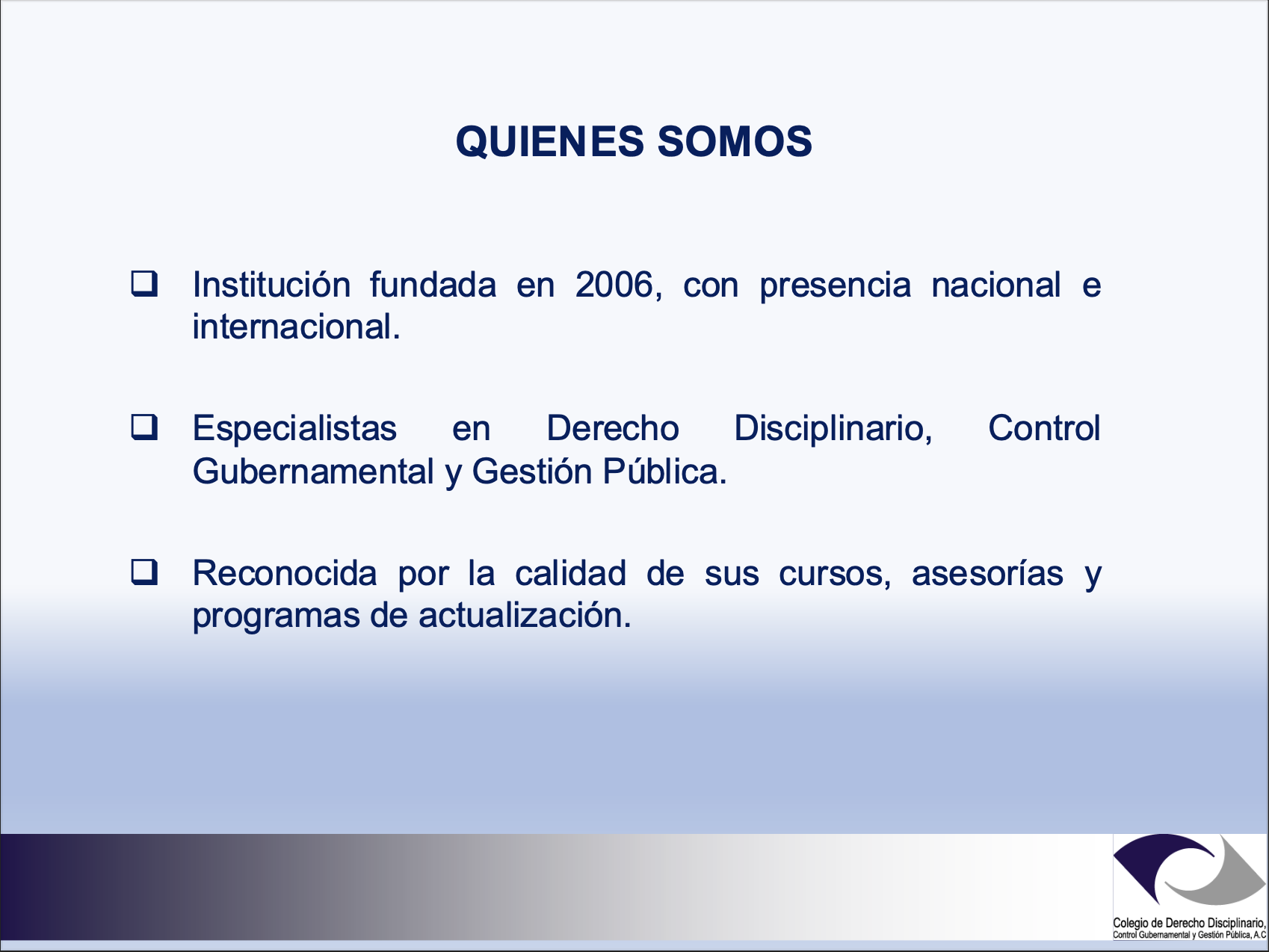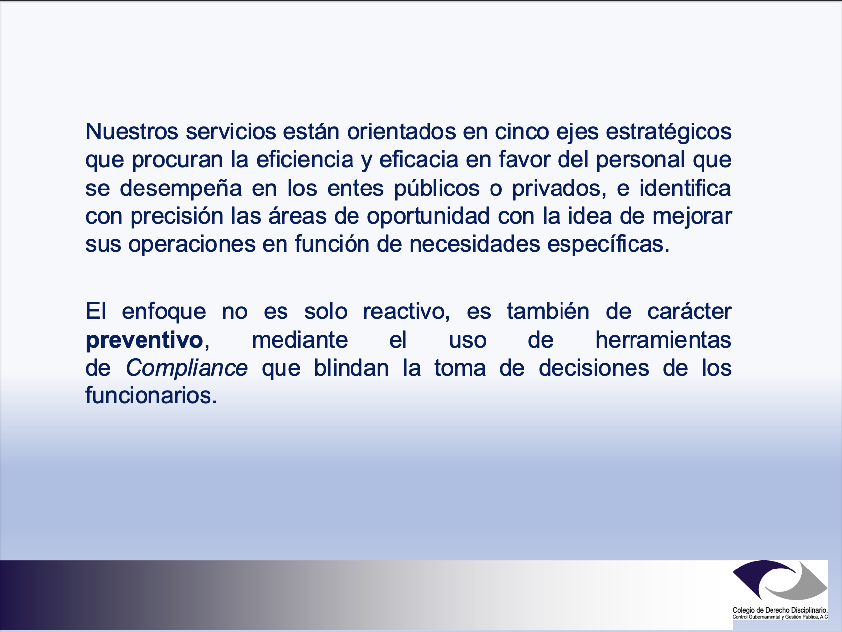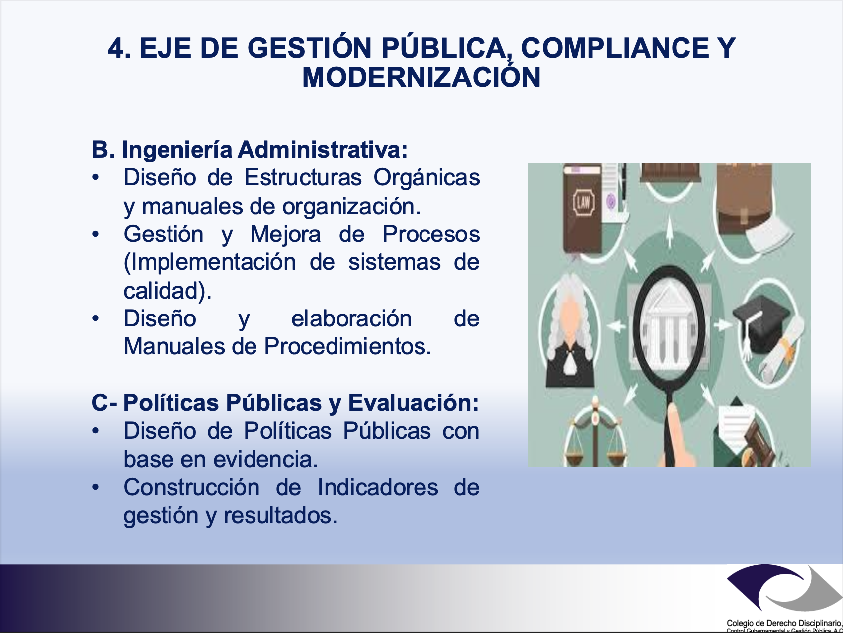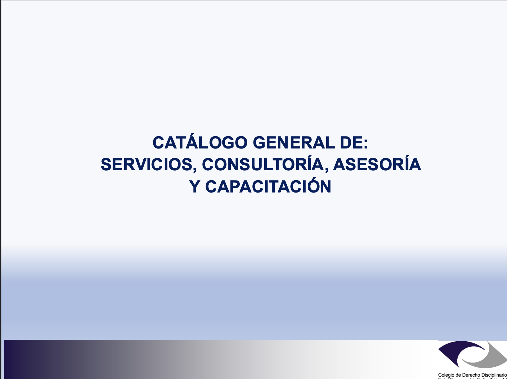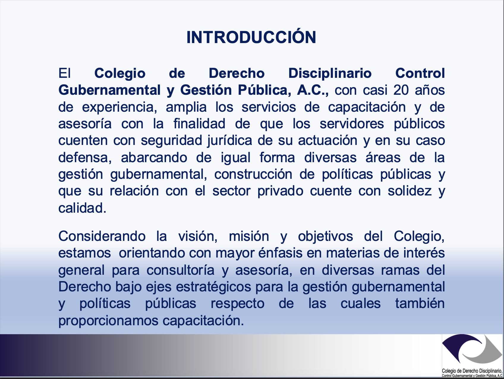 El Colegio de Derecho Disciplinario Control Gubernamental y Gestión Pública, A.C., ofrece los servicios de capacitación y en forma complementaria te ofrecemos asesoría, gestión y litigio en diferentes ramas del Derecho, en sus diferentes áreas, disciplinas y técnicas diversas. Al tocar el link, verás la gama de temas que ofrecemos, y en su caso, poder apoyarte en lo que necesites.
