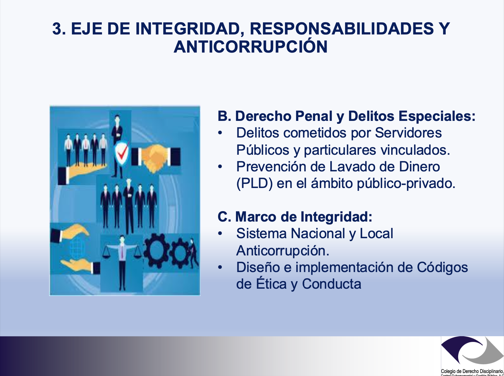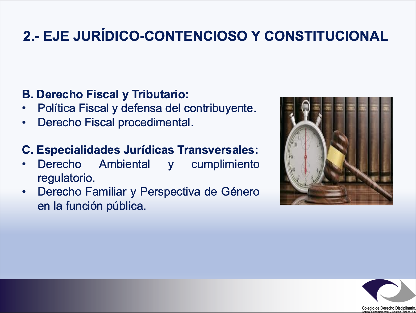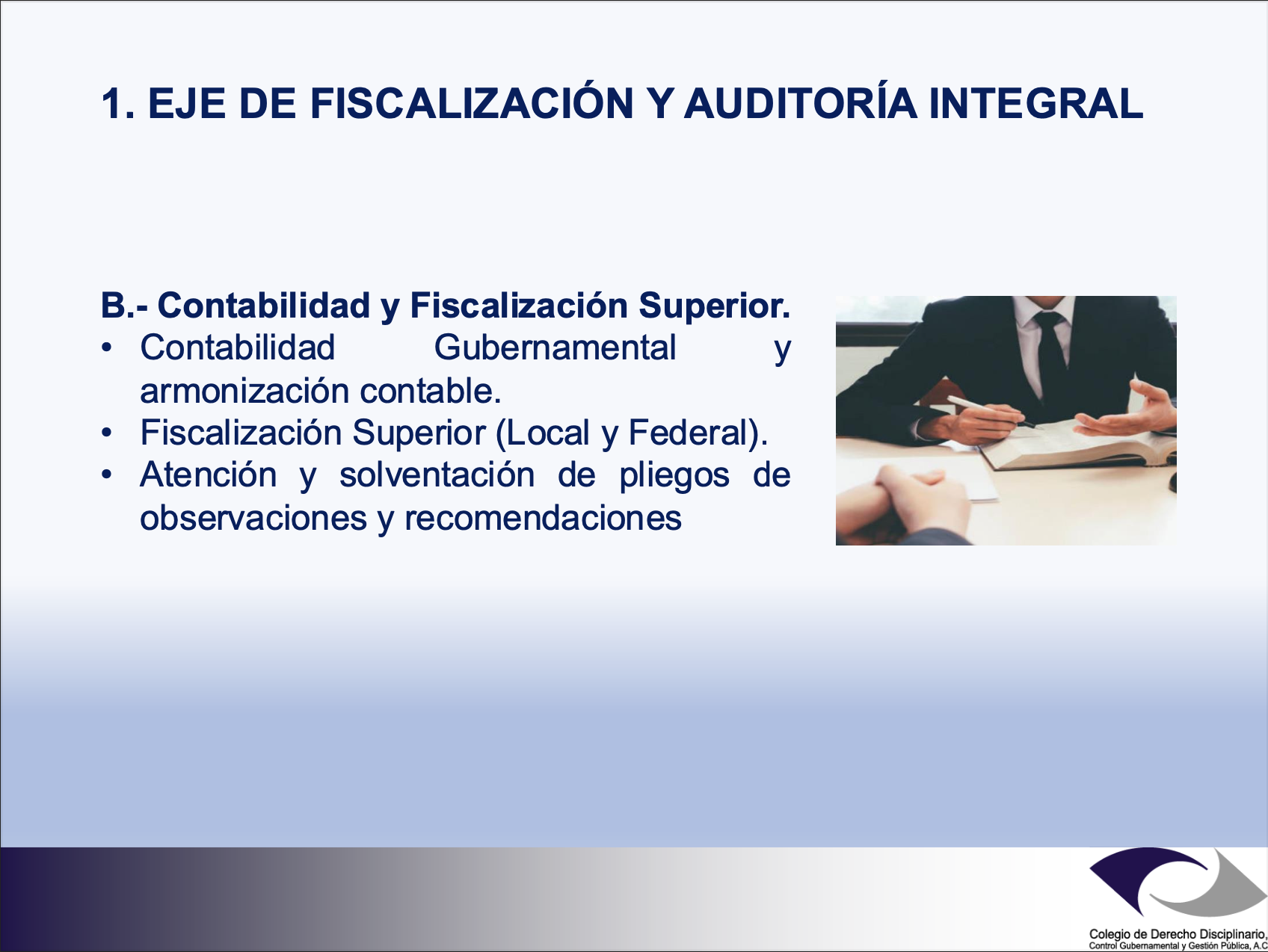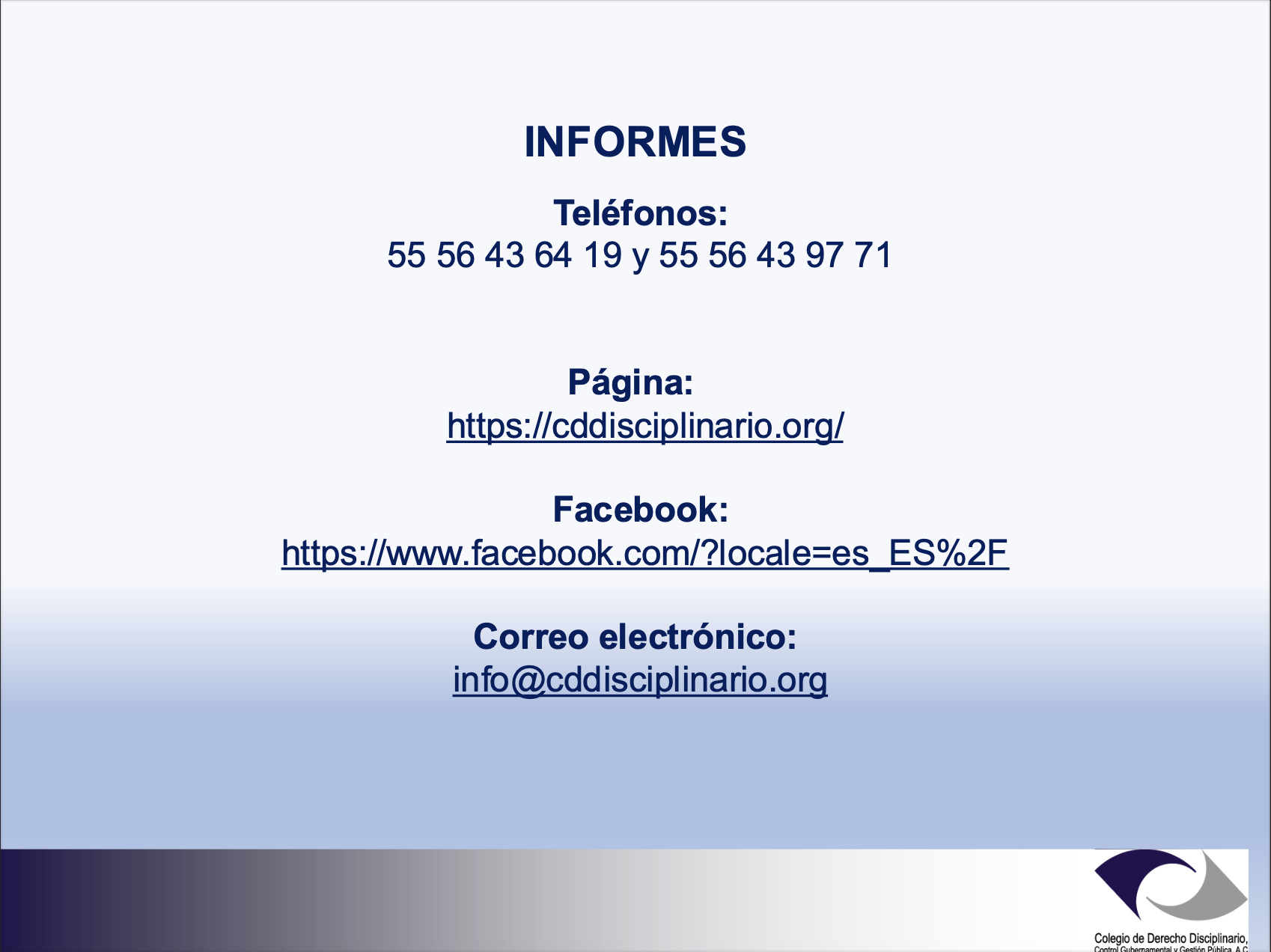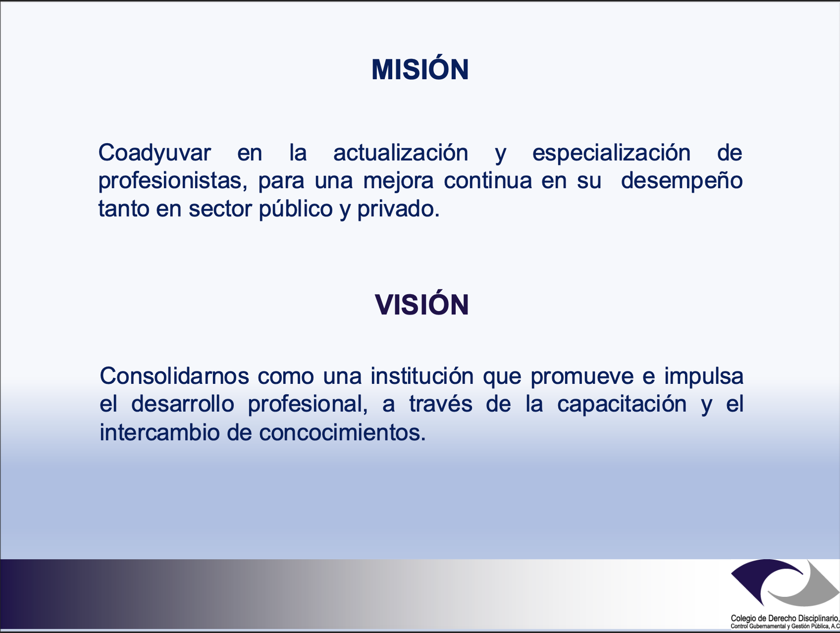 El Colegio de Derecho Disciplinario Control Gubernamental y Gestión Pública, A.C., ofrece los servicios de capacitación y en forma complementaria te ofrecemos asesoría, gestión y litigio en diferentes ramas del Derecho, en sus diferentes áreas, disciplinas y técnicas diversas. Al tocar el link, verás la gama de temas que ofrecemos, y en su caso, poder apoyarte en lo que necesites.