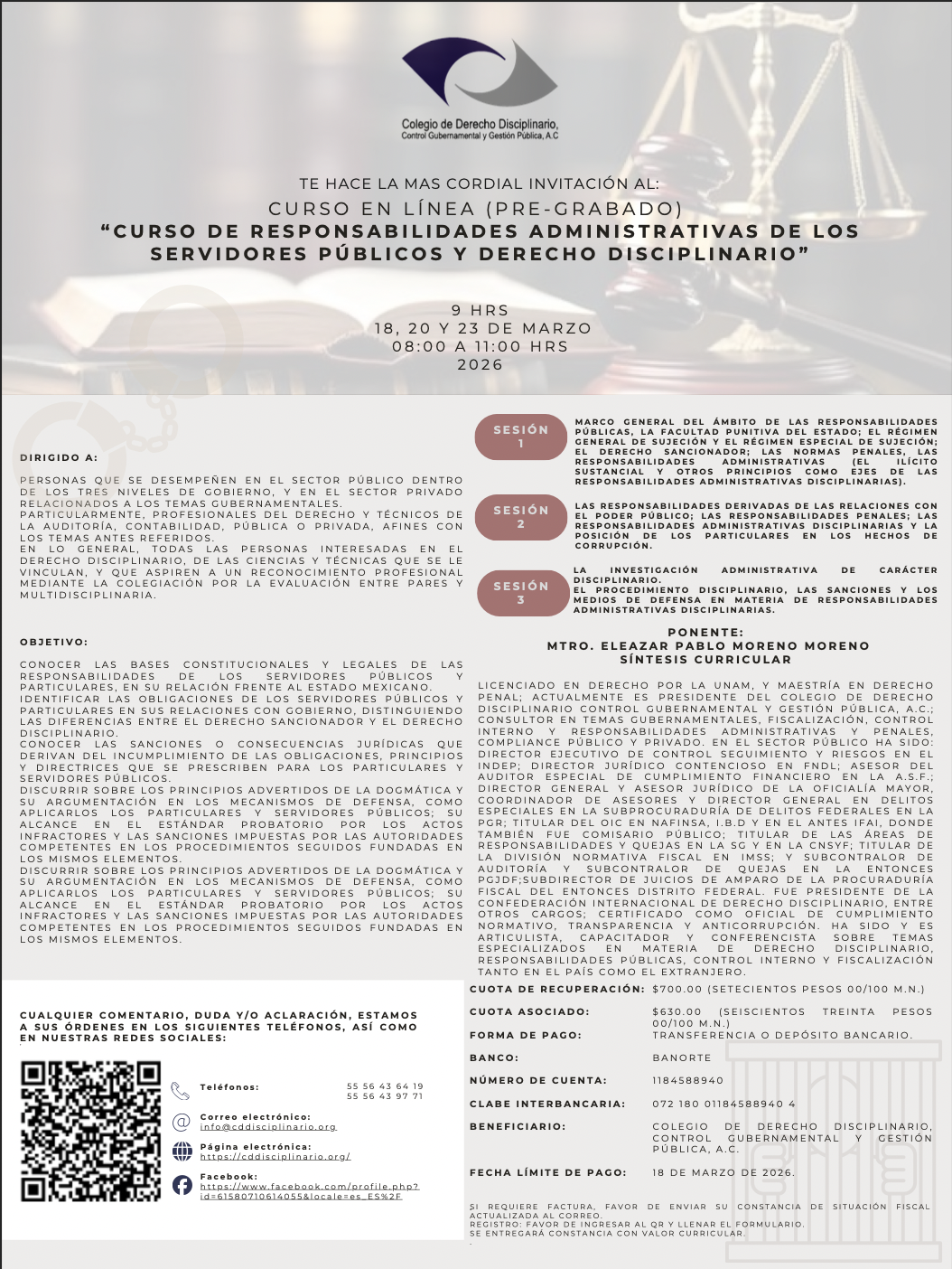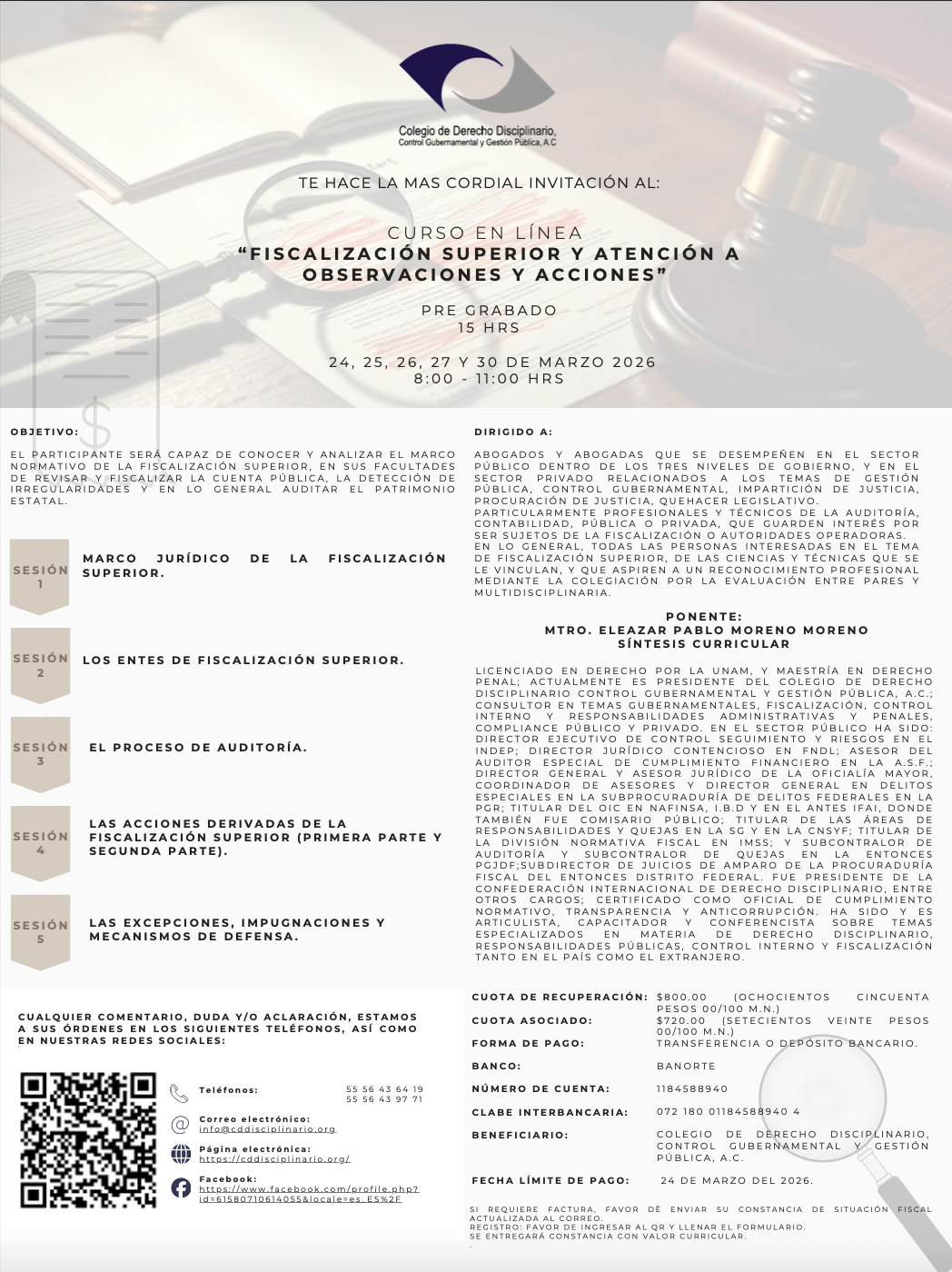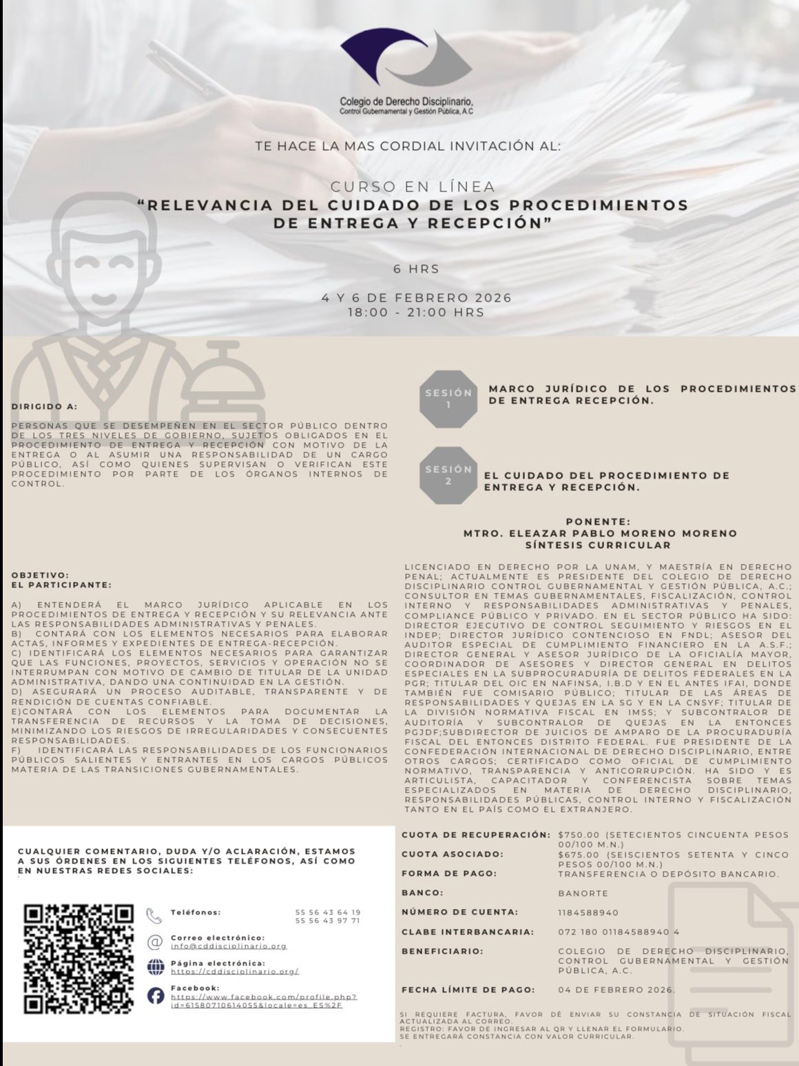 En este link podrás encontrar los cursos que el Colegio de Derecho Disciplinario, Control Gubernamental y Gestión Pública, A.C., ofrece y que son impartidos por docentes profesionales en la materia, contando con la calidad, credibilidad y seriedad que tu requieres, pues obtendrás las herramientas, conocimientos, capacidades y competencias que servirán de base a futuro en tu vida profesional y personal. De igual forma, podemos desarrollar un curso a la medida de tus necesidades. Es importante que, sí representas alguna institución pública y privada, consideres la capacitación al personal a tu cargo, como una inversión.