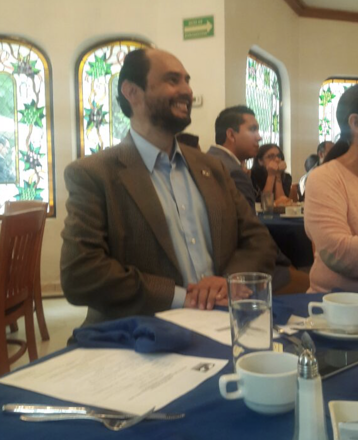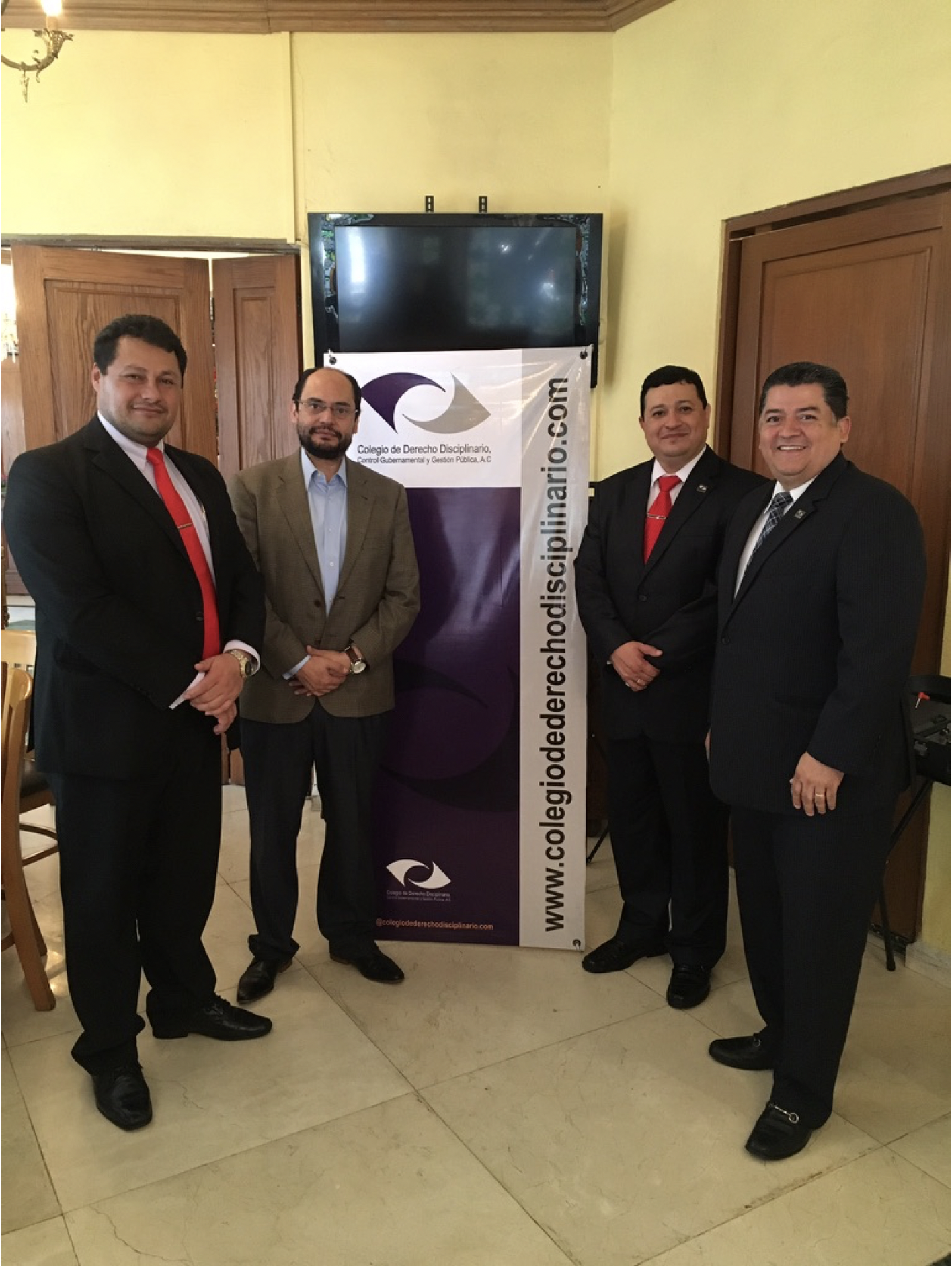 El Desayuno. Mtro. Eleazar Pablo Moreno Moreno y el Mtro. Juan Marcelino González Garcete, de Paraguay, flanqueando el banner del Colegio de Derecho Disciplinario, Control Gubernamental y Gestión Pública.